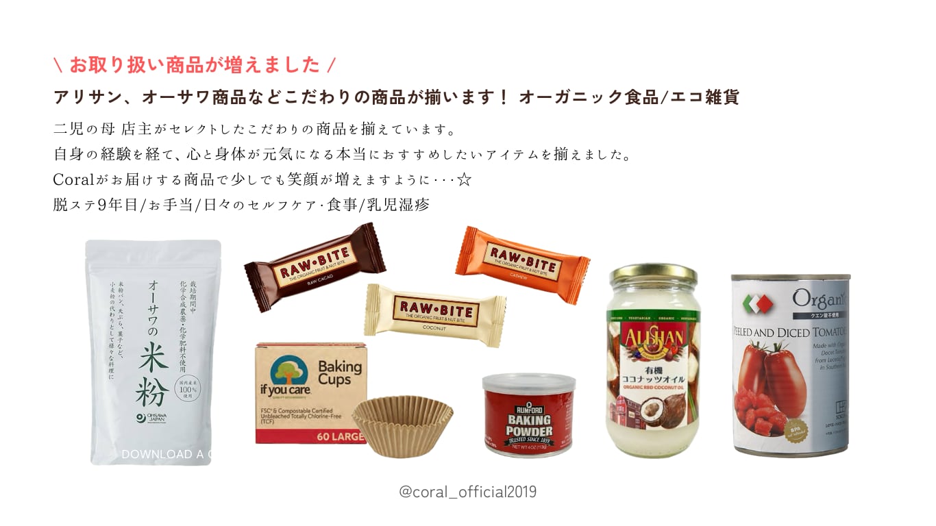 ホリスティックナチュラルストアcoralでは、 〝自然のお恵み〟である「蜂蜜」を中心に世界中から厳選したこだわりの商品を取り扱っております。 心にも身体にも地球にもやさしいがコンセプト。 どうぞ作り手の想い、大地のエネルギーのつまった商品をお楽しみください。 ※有限会社ルカプリスの正規はちみつ代理店です。 有限会社 ルカプリスが定める条件を満たす、把握している蜂蜜のみを信念を持って販売しております。