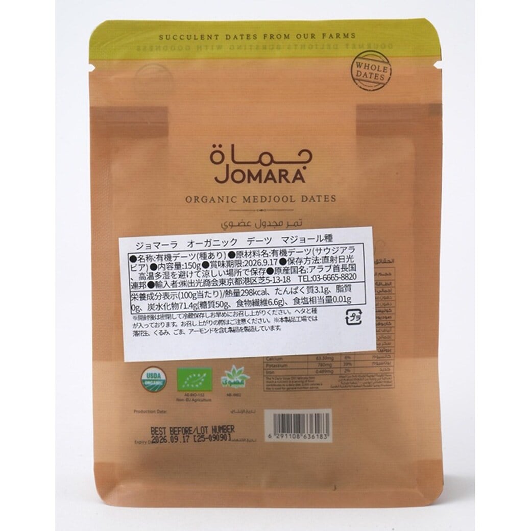 サウジ発の高級デーツブランド「Jomara(ジョマーラ)」の「マジョール種」オーガニックデーツです。 キャラメルのような濃厚な甘みと微かに香るトフィーのような風味が特徴です。