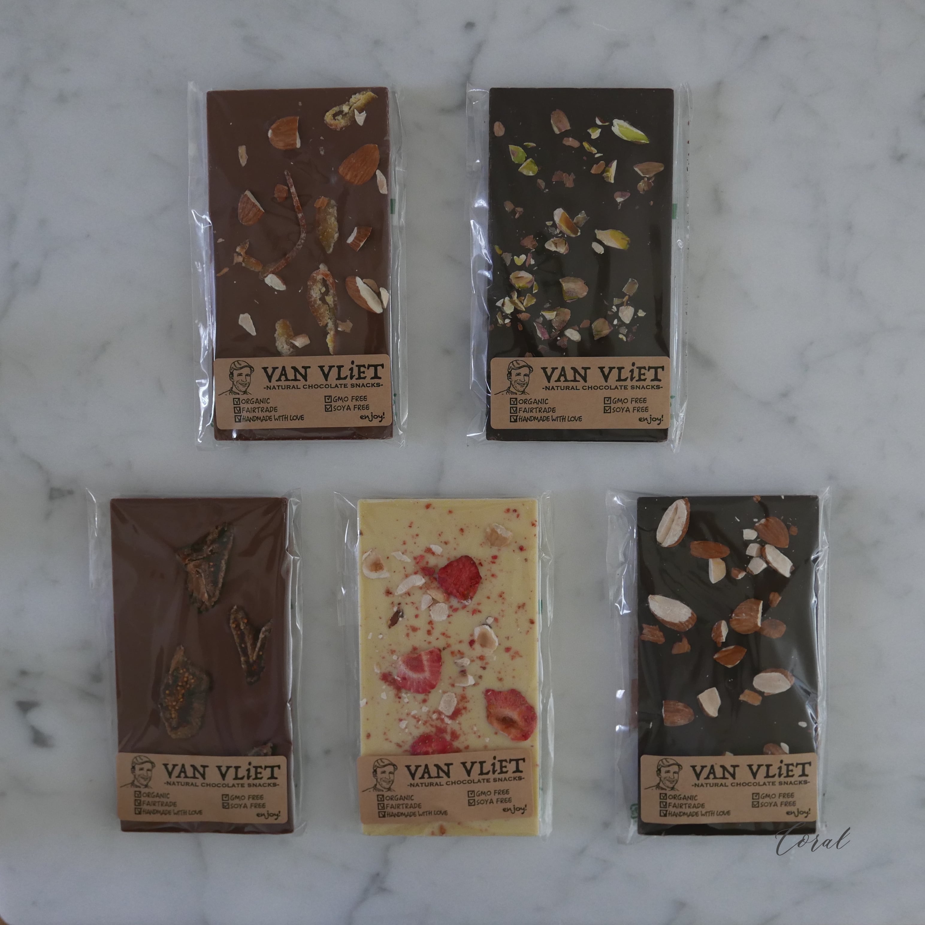 有機ダークチョコレートに、有機ピスタチオをトッピングしました。