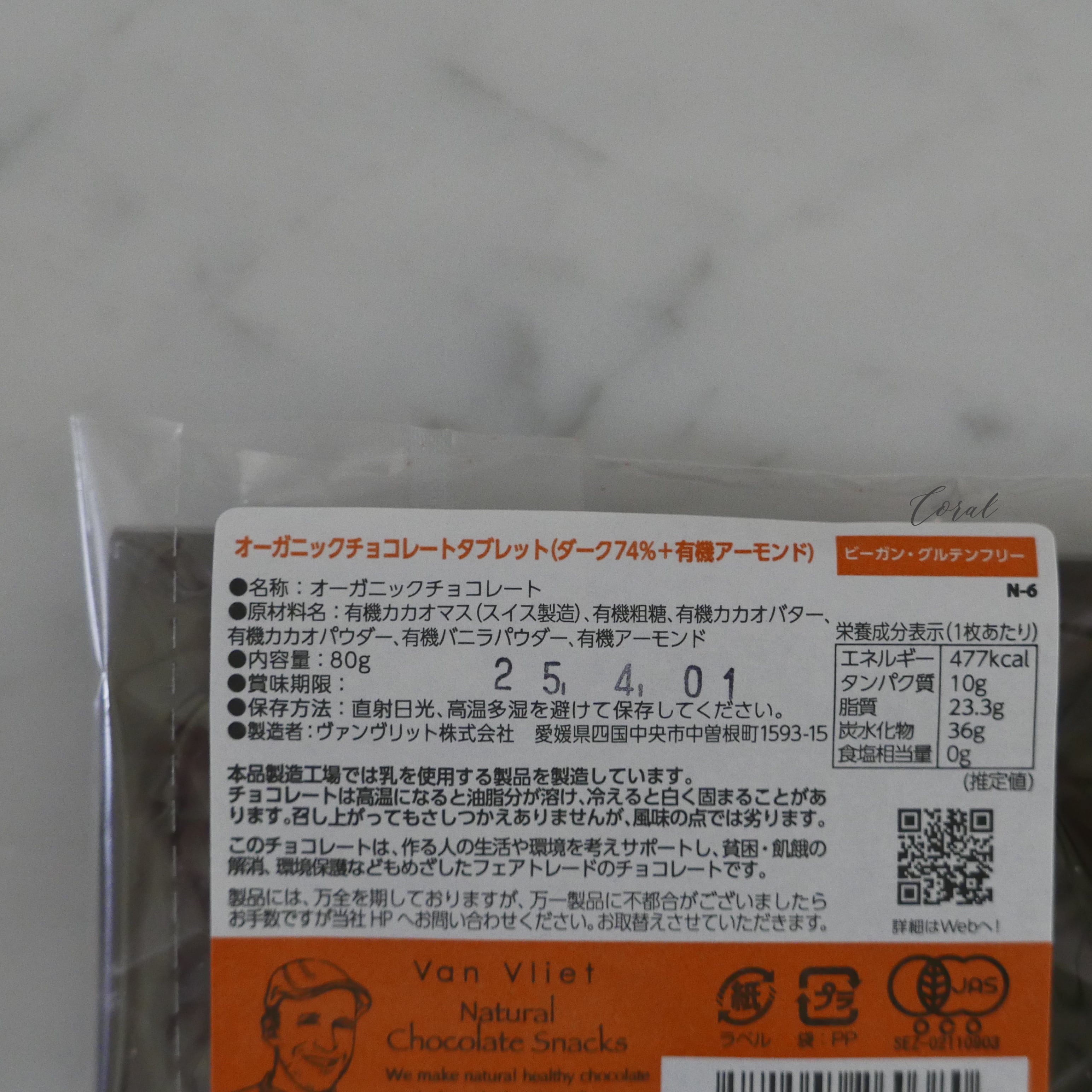 有機カカオマス、有機粗糖、有機カカオバター、有機アーモンド、有機カカオパウダー、有機バニラパウダー
